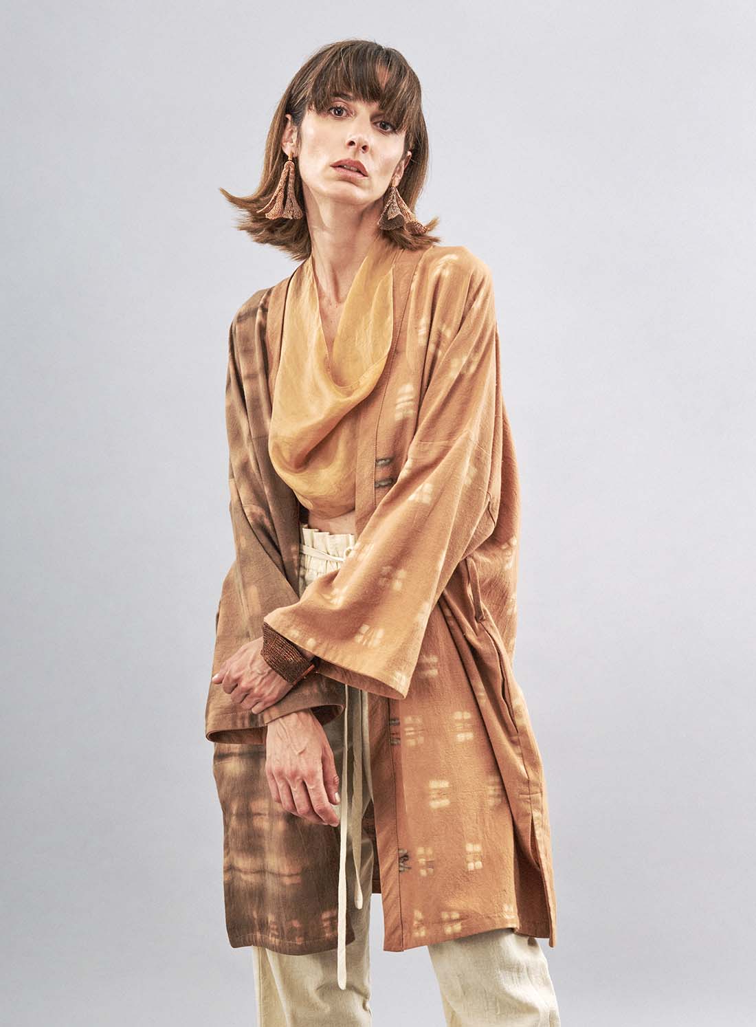 Somos una marca de indumentaria comprometida con la filosofía del Slow Fashion. En nuestro taller, confeccionamos prendas y accesorios cuidadosamente hechos a mano utilizando fibras naturales como algodón, lino, seda y lana. Aplicamos diferentes técnicas textiles, como el shibori (una antigua técnica de teñido por reserva), tejido a palillo y tintes naturales.